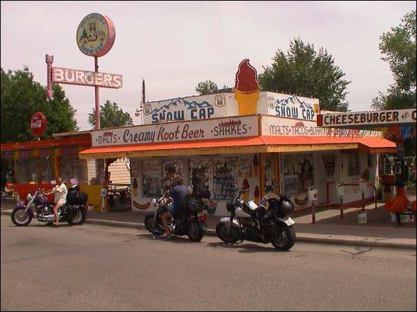 Seligman kann von den Touristen leben, entsprechend verrückt ist der Ort hier auch. Zuerst trifft man auf den Eisladen von Juan Degaldillo, dem Snow Cap Inn. Der Laden war geschlossen, weil der Besitzer auf einer Hochzeit war. Macht nichts: So hatten wir mehr Zeit, seinen Garten mit seinem ausgeflippten Route66-Kitsch und das berühmte Snow-Cap zu erkunden. |